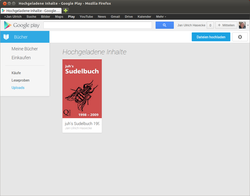 Man kann das Buch nun wie jedes andere Buch in Play Books auf allen Geräten lesen, die mit dem Konto verbunden sind. Wer das gleich einmal ausprobieren möchte, kann gerne meine Sudelbuch-Leseproben dazu benutzen. Leider kann man selbst hochgeladene Bücher noch nicht mit anderen Lesern teilen. Schade eigentlich.
