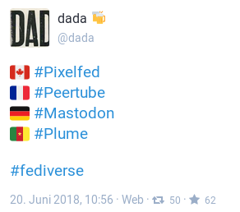 Kürzlich lief ein Toot durch meine Timeline, der bei mir ein kleines Aha-Erlebnis auslöste. Ein gewisser dada listet in der Nachricht vier Software-Projekte auf, die auf dem neuen W3C-Standard ActivityPub aufbauen. Neben die Namen der Projekte setzte er die Flagge des Landes, aus dem der Hauptentwickler stammt.